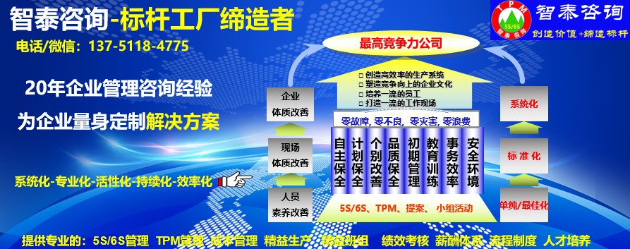 深圳智泰下屬TPM咨詢公司推進的TPM管理不僅僅是設備管理,而是企業(yè)的全面改善,智泰專業(yè)團隊以現場三現為主展開企業(yè)的持續(xù)改進,幫助企業(yè)提升管理水平,促進企業(yè)可持續(xù)發(fā)展,最終達成行